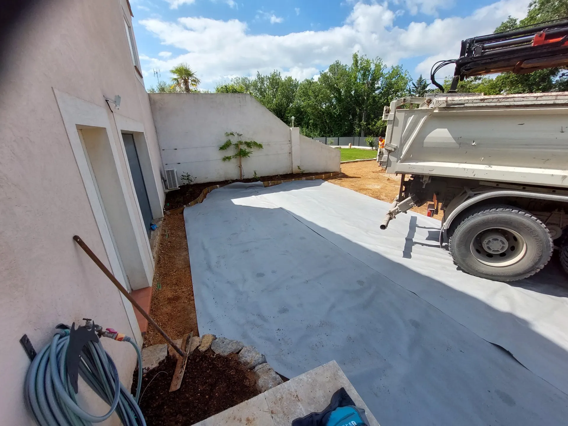 Apres le travail de préparation incluant le terrassement et l'évacuation des terres, un film géotextile à été posé sur le support afin d'éviter la repousse d'herbe.