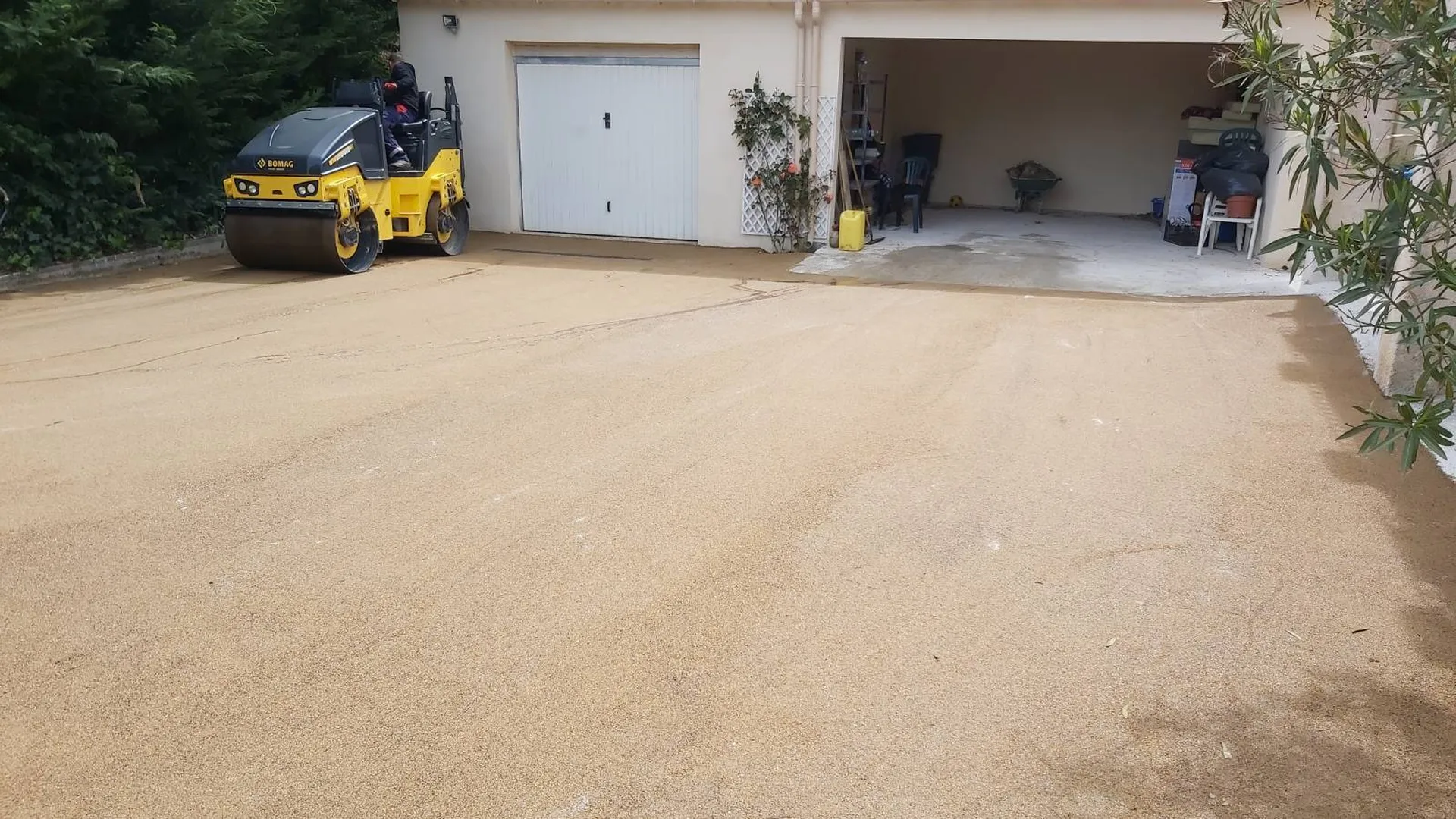 Après le travail de préparation (décaissement et évacuation de l'ancien support, mise en place d'un géotextile afin que l'herbes ne repoussent pas, apport en GNT et réglage du support) nous avons appliqué un enrobé de bitume ocre afin que cette cour puisse se marier parfaitement avec les couleurs de la maison et de l'environnement.