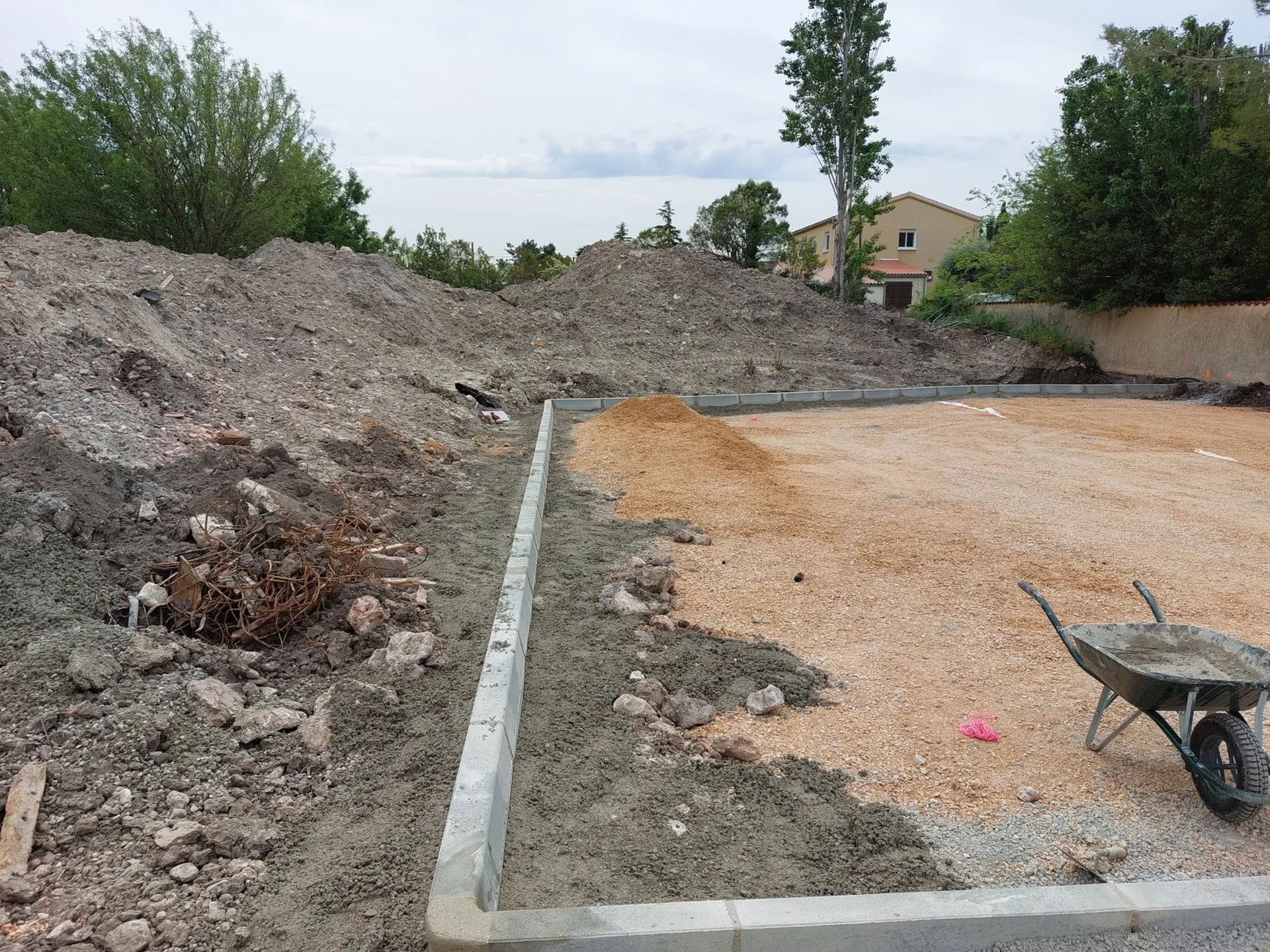 Après avoir delimiter la surface du parking par la pose de bordures T2, nous avons appliqué un enrobé de bitume noir avec un finisseur.