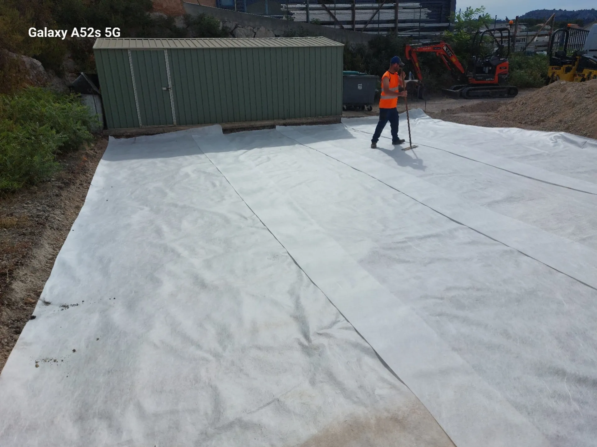 Après le décaissement de la surface, la mise en place d'un géotextile afin d'éviter les repousses d'herbes, nous avons mis en place un enrobé de bitume noir.
