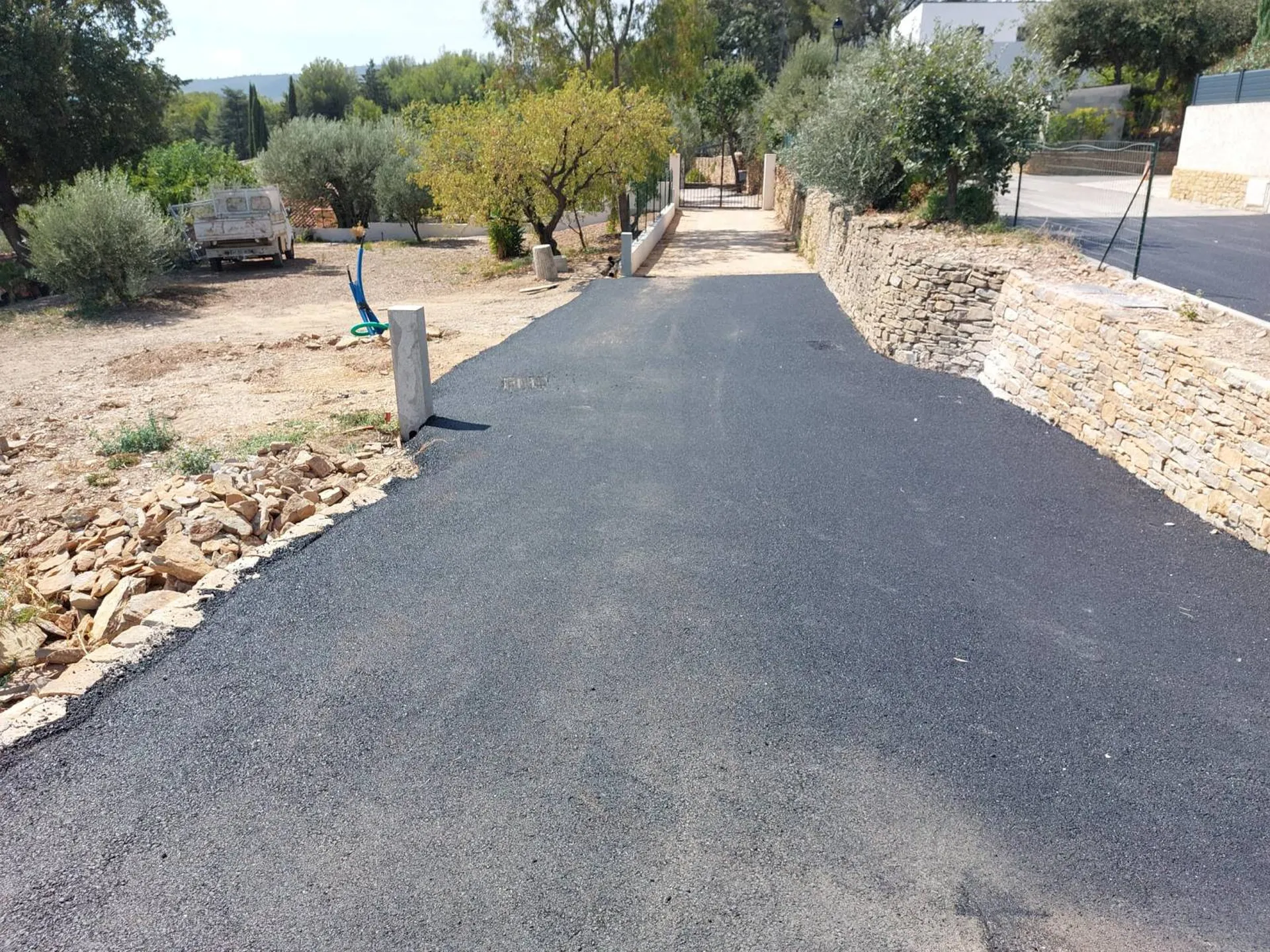 Réfection d'un chemin de copropriété en enrobé de bitume sur Saint Maximin la sainte baume dans le Var.Après la mise en forme du support et la réalisation des pentes d'écoulement des eaux pluviales, nous avons appliqué un enrobé de bitume  noir BBSG 0/1...